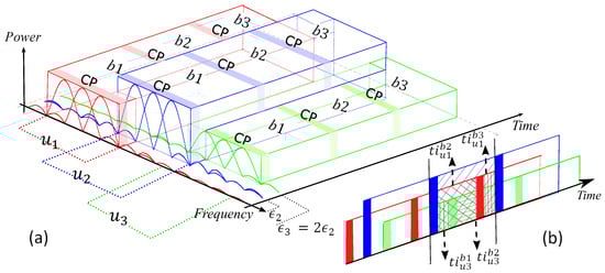 Consider a system model which includes users with 3 OFDM-IM blocks to analyze ICI because of time offset between the users. These users transmit sporadically in adjacent bands with different transmit power levels, as illustrated in Figure 5a. For the sake of simplicity, it is assumed that equal time offset between the adjacent users. Notations of , and in the figure denote first, second and third OFDM-IM block, respectively.