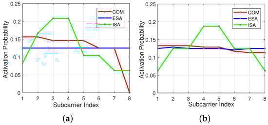 In Figure 6a,b subcarrier activation probability is represented by the red line for COM scheme. As seen in the figures, initial subcarriers have higher usage probability in comparison to the last ones, especially for and .