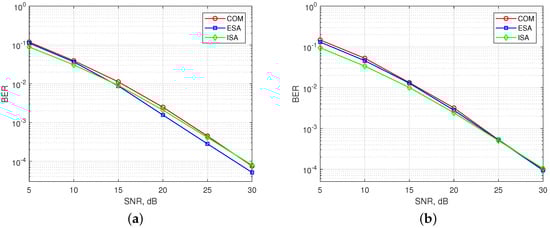 In Figure 7, BER performance of existing SMS-s and the ISA are simulated for synchronous communication, where all users arrive to the BS at the same time (). Figure 7a shows the results for OFDM-IM with . ESA mapper is superior to COM mapper as aforementioned. BER performance of ISA lies in between COM with (, ) and COM with (s, v) because of subblock division property. Therefore, the performance of ISA is the best for low signal-to-noise ratio (SNR). Its performance goes near to COM as SNR increases. In Figure 7b, obtained results are illustrated for . The performance of ESA is similar to COM [].The performance of ISA is almost the same with ESA and COM for high SNR, while it outperforms for low SNR due to subblock division.