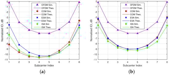 ICI analysis for OFDM and OFDM-IM regarding to three SMS-s. (a) SMS-s with and . (b) SMS-s with and .