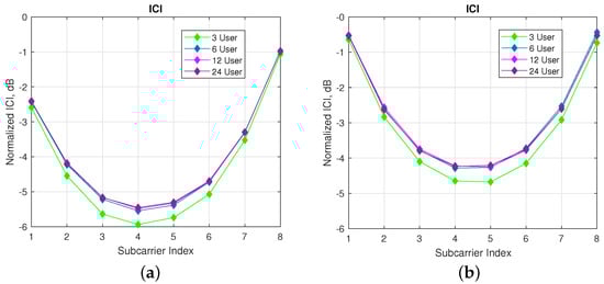 In Figure 9, ICI analyzes on reference user are performed regarding different number of machine users with a fixed number of subcarriers per user. As seen in the Figure 9a,b, nearly 0.5 dB more interference is observed for 6 users compared with 3 users case. For more than 6 users, there is a very slit increase in the ICI. Hence, the amount of the interference coming from far users proportionally decays with the increase in the number of users.