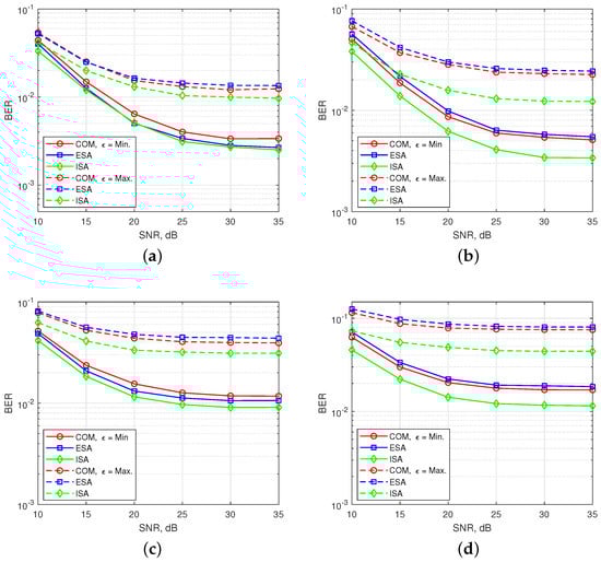 In Figure 10, BER performances are obtained for 2-nd user under time and power misalignment. In Figure 10a,b, only time misalignment between the users is considered. As seen in the Figure 10a, ISA with (, ) has the best BER performance, but with a slight difference from ESA for . Edge subcarrier activation probability for ESA is higher in comparison to COM and ISA, as shown in Figure 6. Therefore, ICI coming from adjacent users to the 2-nd user further increases for ESA. For , the difference between the performances of SMS-s is more obvious and ESA has the worst performance. COM has a slight better BER performance than ESA as observed in the Figure 8b. ISA offers a much better BER performance for maximum time misalignment, since it has the smallest edge subcarrier activation probability associated with the lowest ICI. In Figure 10b, OFDM-IM with subblock parameters (, ) is simulated. The performance of both ESA and COM become much worse than in Figure 10a. For ISA with (, ), subcarrier usage probability is more localized around the middle subcarriers than in the case of ISA with (, ), as shown in Figure 6. Moreover, equiprobable activation properties of ESA causes a destructive effect on the BER performance due to non-uniform distribution of ICI. For COM, less activation probability of one edge provides better protection against ICI caused by asynchronism between the users in time. In Figure 10c,d, power difference between the users is also considered as well as time offset. The advantages of ISA against asynchronous transmission impairments are much more visible with the increase of ICI. Not only power difference but also increased number of active subcarriers within the OFDM-IM subblock results in higher ICI. Therefore, ISA mapping scheme plays a key role for larger subcarrier activation ratio of in asynchronous mMTC networks.