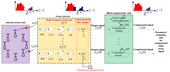 The antenna arrays unit exists at the head of the system, where it is to capture the array signal. Then, the array data is transmitted to the array receiver. Each channel RF front-end of the array receiver has some nonlinear analog circuits and an ADC (analog to digital converter). The analog module usually consists of a bandpass filter (BPF) with high suppression ratio, a low-noise amplifier (LNA), a variable-gain amplifier (VGA), a low-pass filter (LPF) and more. The full-band array signal is achieved by filtering the input signal with a BPF in each channel of the array receiver. It is then amplified to the required level by a first-stage LNA and a first-stage VGA. Additionally, the amplified signal without out-band clutter obtained by an LPF is transmitted to the synchronization ADC module in which all ADCs’ sampling clocks are from the same crystal oscillator. These procedures are applied to synchronously gather and output the array signal. The blind compensation unit is designed to mitigate or even eliminate the distortion product supplied from the multi-channel array processing system with the aim to improve the parametric estimation accuracy of the array signal.