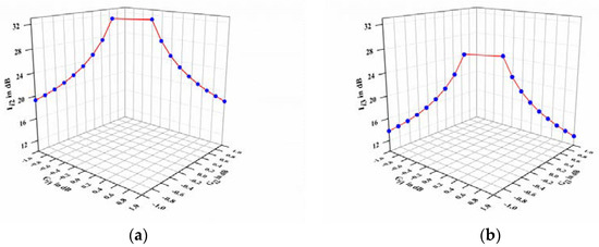 Based on Equations (19) and (21), the authors obtain the calculation results for and , as shown in Figure 2, which demonstrates that is approximately 16–32 dB and is about 12–24 dB. Therefore, the results prove that this novel method could significantly compensate each channel’s nonlinear distortion of array receiver.