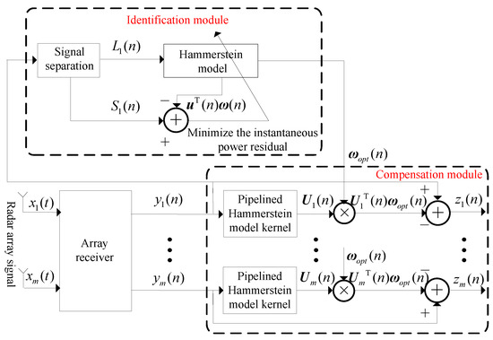 Moreover, the identification criterion should be applied to each channel for extracting its identification coefficients if each channel is regarded to be an independent and irrelevant nonlinear system. The disadvantages are as follows: first, the system hardware resource is increased significantly. Most importantly, the inconsistent compensation performances of different channels, especially the phase disturbance of the post-compensation array signal, are caused by the iterative computation error of the proposed identification criterion. However, the input array signal and the linear/nonlinear transfer functions of each channel are similar. A more suitable method is to blindly identify and extract the nonlinear model kernel coefficients of any one of the channels and then to employ the extracted kernel coefficients to synchronously mitigate the nonlinearity of all channels. Consequently, the authors propose an effective digital compensation method for an array signal processing system.