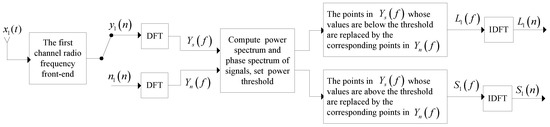 - Each point of is compared with the setting power spectrum threshold. Next, frequency-domain large signals are obtained with the method that the points in , whose values are below the threshold, are replaced by the corresponding points in , whereas the others remain. Conversely, frequency-domain small signals, is gained by the replaced points in whose values are above the threshold.