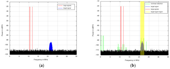 Figure 10a,b illustrate that the two weak array signals are both seriously interfered by unwanted in-band nonlinearity and that the SINRs of the two signals are below 0 dB. However, after compensation, the SINRs of the two signals are both increased by approximately 10 dB. Therefore, the two array signals are the typical examples the authors research.