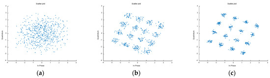 The constellations of the 16-QAM (quadrature amplitude modulation) signals: (a) distorted weak 16-QAM; (b) weak 16-QAM after mitigation by singular value decomposition (SVD)-based signal separation method; (c) weak 16-QAM after mitigation by the proposed signal separation method.