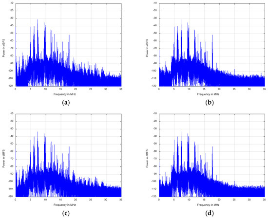 The model parameters of the first channel are extracted and then to alleviate the nonlinear distortion components of all channels in this experiment. Additionally, the nonlinear inverse behavior model for all channels’ RF front-ends is employed by a Hammerstein model with D = 5 and Nd = [3, 3, 3, 3, 3]. Figure 9a,b show the power spectrum of the original and post-compensation array signal in the first channel. Since the input array signals of all channels are similar and their compensation results are also similar, it is only necessary to show the power spectrum of the signal before and after compensation in other channels such as the second one, which are shown in Figure 9c,d.