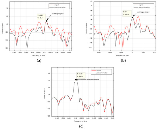 Power spectrum comparison between the original and post-compensation of three target signals in the first channel: (a) weak target signal-1; (b) weak target signal-2; (c) strong target signal.