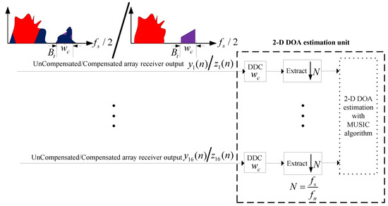 The direction-finding performances of the above-mentioned array signals before compensation versus after compensation are discussed. Figure 11 shows the 16-channel array receiver output before compensation is processed through the frequency selection and channelization before their 2-D DOAs (elevation angle and azimuth angle ) are estimated as is the compensated array receiver output where, the channelized sampling rate and bandwidth are = 10 KHz and 8 KHz, respectively. Moreover, the authors employ the MUSIC algorithm to estimate their 2-D DOAs of array signal before and after compensation. Ultimately, the authors provide explicit comparisons about these two estimation results.