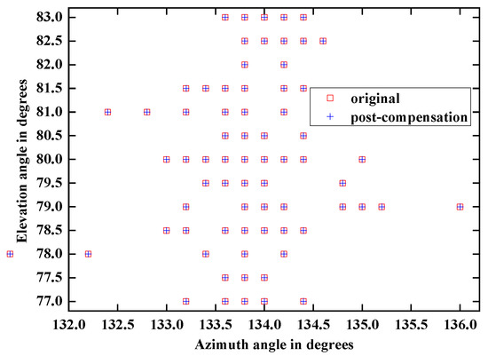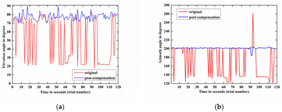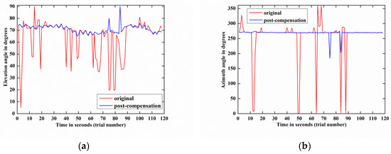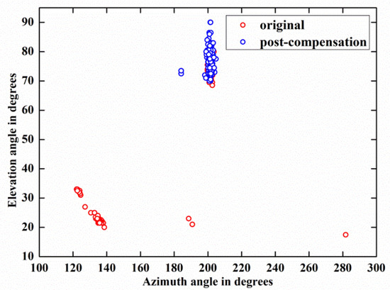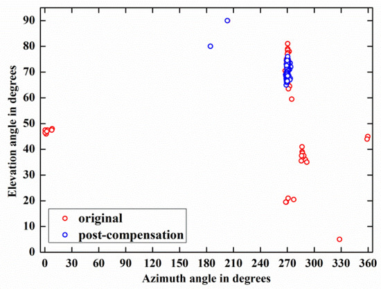 Figure 12 depicts the DOA estimation performances of weak target signal-1 before and after compensation by 118 trials and demonstrates that the estimation result of the post-compensation signal is much more accurate than that of the original signal. Meanwhile, the same phenomenon also happens on weak target signal-2, as shown in Figure 13. These phenomena are observed more directly from the azimuth-elevation scatter figures, Figure 14 and Figure 15.
