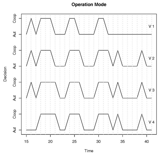 Let A be the subset of vehicles that are in the autonomous operation mode in round r and let C be the subset of vehicles that are in the cooperative operation mode in round r. Observe that each vehicle sends the autonomous operation mode and each vehicle sends the cooperative operation mode in round r. At the beginning of round , each vehicle sets the operation mode according to the following rule: