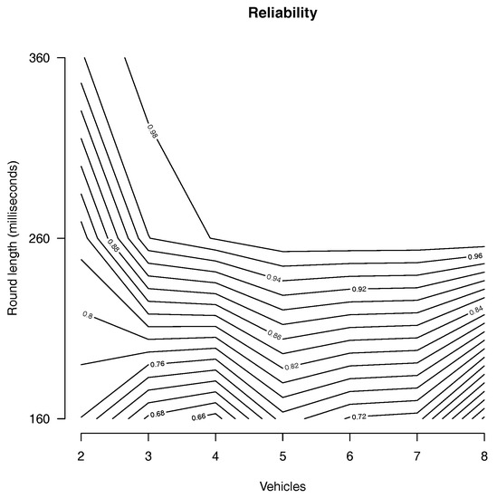 During the simulations, we observe an average packet drop of . The reliability is plotted in Figure 3 where the x axis represents the number of vehicles, the y axes represents the round length and the contour lines represent the reliability. We can observe from the plotting that for round length of 260 ms, the vehicles operate in cooperative mode for of the time when more that 3 vehicles are involved. However, it is reduced to and with three and two vehicles, respectively. Observe that the reliability increases with more vehicles. For instance, with 4 vehicles, Algorithm 1 maintains the cooperative operation mode of the time. Meanwhile with 2 vehicles, the cooperative operation mode is reduced to . This is because of the transitivity property of the gossip protocol. Nevertheless, during the percentage of time that Algorithm 1 cannot maintain the cooperative operation, the safety of the system is kept by guaranteeing that the vehicles do not disagree for more than one consecutive round.