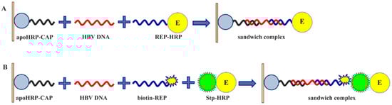 Schematic illustration of the microplate chemiluminescent assays for HBV DNA detection using (A) HRP-REP conjugate and (B) biotinylated REP and HRP-streptavidin conjugate as signaling systems.