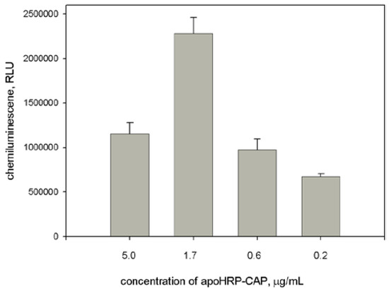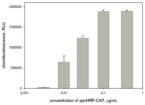 In our work we compared two HRP signaling systems. The first system was based on the use of HRP-REP conjugate (Figure 1A). The synthesis of HRP-REP conjugate was described previously [26]. To optimize assay conditions, the concentration of apoHRP-CAP (5:1) varied in the coating solution. The chemiluminescent intensity strongly depended upon the concentration of apoHRP-CAP (5:1). The obtained resulted showed that the optimal concentration of this conjugate was 1.7 μg/mL.