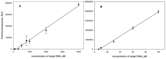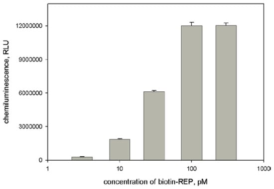 The dependences of light output upon the target concentration allowed us to calculate analytical parameters for the developed assays (Figure 7). For the assay using HRP-REP the detection limit, calculated with 3σ method, and linear range were 50 pM and 300–4000 pM (R2 = 0.9914), respectively. The sensitivity of this assay was 158 RLU/pM of target. This assay has not only low sensitivity, but low precision too (CV 10–30%).