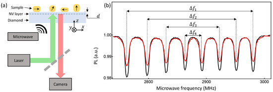 (a) Schematic of the experimental setup. The sensing platform consists of a diamond substrate hosting a layer of near-surface nitrogen-vacancy (NV) centres. The magnetic samples to be imaged (here magnetic nanoparticles shown as yellow objects; the arrows depict their magnetisation) are placed directly on the diamond surface. The NV photoluminescence (PL) under green laser and microwave excitations is imaged on a camera to form the magnetic field image of the sample via optically detected magnetic resonance (ODMR). (b) Example ODMR spectra obtained from a single imaging pixel nm in size. Measurement of the four Zeeman splittings () allows reconstruction of the local vector magnetic field. The two spectra correspond to two different locations on the sample, namely near (red) and laterally far from (black) a magnetic particle (see details in text and Figure 2c).