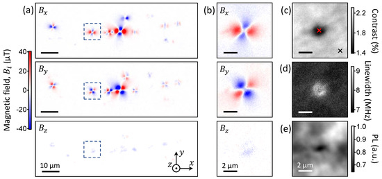The results are shown in Figure 2a for a m area, after subtracting the bias magnetic field . Several localised sources of magnetic field of various intensities can be seen, with local maxima up to ≈100 T, corresponding to individual magnetic nanoparticles of different sizes. The magnetic field pattern looks relatively similar for all particles, with Figure 2b showing a zoom-in of a representative particle. The in-plane components ( and ) both form a four-lobe pattern, while the out-of-plane component () has a much weaker intensity and its shape is not clearly defined. Such patterns are not consistent with the magnetic field produced by a single-domain nanoparticle—roughly equivalent to a magnetic dipole—for which all three components should be of comparable intensity regardless of the orientation of the magnetisation [33]. To gain more insight into this discrepancy, Figure 2c,d show the contrast and linewidth (defined as the full width at half maximum, FWHM) of the lowest-frequency ODMR line, respectively, for the same region as in Figure 2b. At the centre of the four-lobe magnetic field pattern, the contrast decreases from about 2.2% to 1.5%, while the linewidth increases from 7 MHz to 8 MHz. ODMR spectra taken on and off the centre (as indicated by crosses in Figure 2c) are shown in Figure 1b, and confirm that there is significant reduction in contrast from NV centres directly under the particle in addition to a slight line broadening. Additionally, the PL image (Figure 2e) shows a decrease in intensity (~) underneath the particle.
