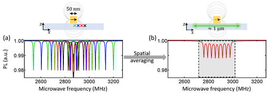 We attribute these effects mainly to the broad distribution of magnetic field strengths experienced by the NVs within the readout volume, which has a lateral extension in the plane given by the optical resolution (≈1 m in our setup). This is illustrated in Figure 3, which shows ODMR spectra as simulated for point-like ensembles of NV centres in the vicinity of a magnetic nanoparticle (Figure 3a), as well as the spatially averaged ODMR spectrum obtained via optical readout with a near-diffraction-limited resolution of m (Figure 3b). Despite the small average Zeeman shifts within the readout volume—T corresponds to a 2.8 MHz shift, much smaller than the spacing between adjacent ODMR lines—NVs close to the source of the stray field experience larger shifts, overlapping or crossing their resonances with those from other NV orientations, or pushing them outside the probed frequency window altogether (Figure 3a). This highly asymmetric frequency dispersion causes an irreversible loss of information in the averaged ODMR (Figure 3b), leading to the observed artefacts in the reconstructed magnetic field. The purpose of the next section is to verify this interpretation through a quantitative analysis.