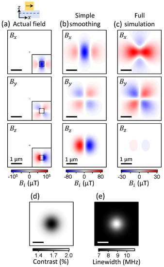 As a result of this limited range, only the NV centres experiencing less than ≈0.5 mT contribute meaningfully to the ODMR spectrum within a given pixel using this approach. The other NVs are either outside the frequency window, or they induce additional artefacts due to line overlapping or crossing. To account for these effects, we modelled the problem as follows: (i) for each pixel of the simulated image ( nm), we add the bias field to the actual field generated by the particle (Figure 4a), calculate the positions of the ODMR resonances, and generate an ODMR spectrum; (ii) we apply a spatial convolution with a 2D Gaussian function (1 m FWHM) to the ODMR maps generated in (i); (iii) for each pixel of the smoothed ODMR maps generated in (ii), we fit the ODMR spectrum with eight Lorentzian lines, exactly as done to the experimental data; (iv) finally, for each pixel we convert the ODMR splittings into the magnetic field components and subtract the bias field. The result of this process is shown in Figure 4c and is markedly different from the actual field after smoothing (Figure 4b). In particular, the component exhibits a very different distribution, close to the four-lobe pattern observed experimentally. The overall shape of the other components is not significantly changed, but the field intensity shows a 1.7-fold reduction in , and more importantly a 25-fold reduction in . These differences can be understood by looking at the actual field (Figure 4a) and removing the regions where the field is above the threshold of 0.5 mT, which affects mostly the central lobe in , as well as the two lobes in . As can be seen by comparing Figure 2b with Figure 4c, our model qualitatively reproduces the main features of the experiments, i.e., the four-lobe pattern in , and the strongly suppressed component. The simulation also shows good agreement with experiment for the ODMR contrast (Figure 4d) and linewidth (Figure 4e) near the particle. We stress that we did not attempt to reach a quantitative agreement between simulation and experiment as there are many unknown parameters, including the exact shape and size of the particle, its magnetisation, and the exact positions of each NV centre (laterally and relative to the surface).
