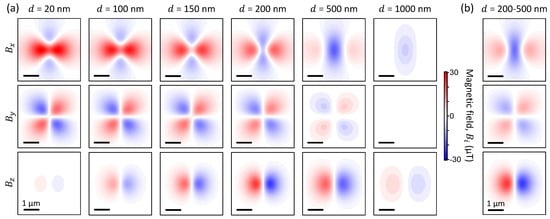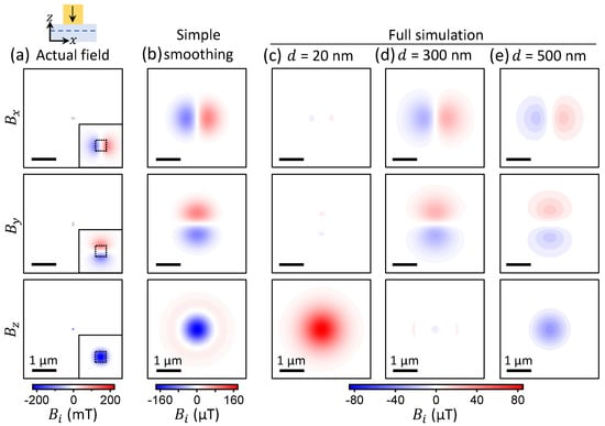 So far, we have examined the case of a magnetic particle with a magnetisation parallel to the diamond surface (along x). We now consider a particle magnetised perpendicularly to the surface (along z), with the same parameters as in Figure 4 otherwise. Figure 6a–c show the actual, smoothed and full-simulation fields as described previously, for this situation. Here, the strongest actual field is in the component, which reaches over 200 mT right under the particle (Figure 6a). When applying a simple Gaussian smoothing with a 1 m FWHM (Figure 6b), the field patterns are simply smeared out, and the amplitude is decreased by three orders of magnitude, down to a maximum of ≈170 T. Including the limited measurement range of the NV sensors, however, gives a very different result (Figure 6c). The planar components and are strongly suppressed (a 15-fold reduction relative to the simple smoothing case), and strikingly the sign of the component is reversed. Similar to the in-plane magnetisation case, the actual field is progressively recovered as d is increased, as shown in Figure 6d,e. Interestingly, the component is nearly vanishing at a cross-over distance nm (Figure 6d).