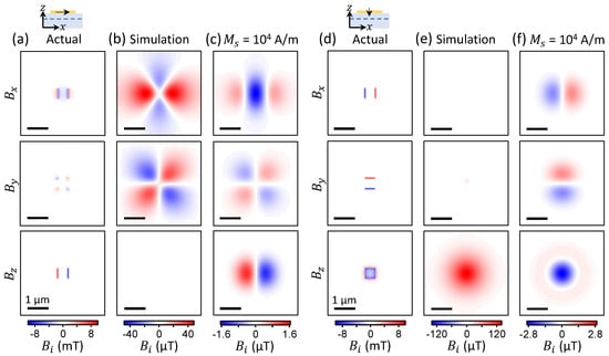 This situation is illustrated in Figure 7, which shows magnetic field calculations for a nm flake magnetized in the plane (panels a–c) or out of plane (d–f). For a strong ferromagnet ( A/m) the field exhibits maxima near 10 mT (Figure 7a,d). This is an order of magnitude less than in the case of the nanoparticle even though the total magnetic moment is similar in both cases, simply because the source of the field is less concentrated laterally. However, the field still largely exceeds the NV range under our measurement conditions and therefore leads to artefacts. In particular, compared to the nanoparticle case there is an even stronger suppression of the perpendicular component (planar components) for the in-plane (out-of-plane) magnetised flake (Figure 7b,e, respectively). It is interesting to note that because the artefacts are sensitive to the local values of the actual magnetic field, they provide a pathway to distinguish different shapes and sizes of the magnetic object—compare, e.g., Figure 4c (cubic particle) with Figure 7b (thin flake)—while they would be essentially indistinguishable otherwise.