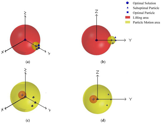 For the second case shown in Figure 1c, the optimal particle is close to the optimal solution and the suboptimal particles also move in the vicinity of the optimal solution. When the suboptimal particles approach the optimal solution at a high speed, they will rush though the lifting area and continue to oscillate in the yellow area, which means the particles will not enter the lifting area. In this case, in order to improve the accuracy of the solution, it is necessary to reduce the velocities of the particles, which means the particles will require a smaller inertia weight value to approach the optimal solution slowly.