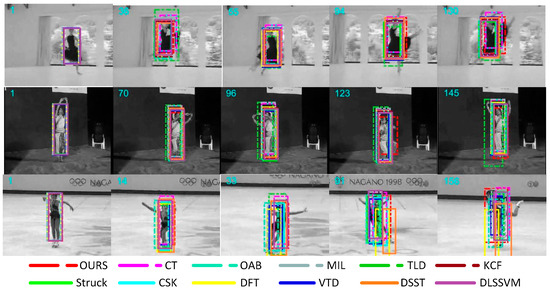 In Figure 3, Carscale, Human6, and Singer1 were used as the test sequences with scale variation during the object movement. In the Carscale sequence, there are not only obvious changes in scale, but there is partial occlusion. In the 152nd frame, when the target size varies greatly, the algorithm proposed in this paper started to show clear advantages. In the Human6 sequence, DFT and CT algorithms began to lose the object from the 191nd frame. In subsequent image sequences, the target scale changes more significantly and the proposed algorithm could always track the target steadily. In the Singer1 sequence, our algorithm and DSST algorithm showed satisfactory tracking performance compared to other algorithms. Throughout the tracking process, our tracking window could mostly contain the object and the single frame image processing speed was better than 36 milliseconds.