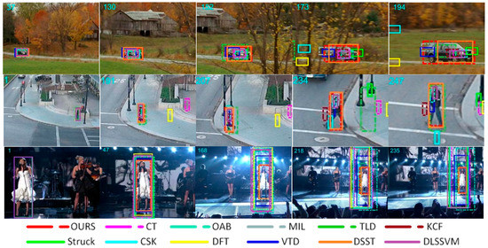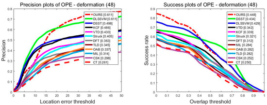 Figure 7 analyzes the performance of the twelve trackers in various tracking states. For all test video sequences, there were 48 groups belonging to object deformation, 50 groups belonging to object scale variation, 59 groups belonging to the out-of-plane rotation group, 48 groups belonging to the in-plane rotation group, and 54 groups belonging to object occlusion. It should be noted that one group of the image sequence may belong to different kinds of groups at the same time because the group of image sequences may appear in a variety of situations. For example, there is not only scale variation, but also a partial occlusion in the Carscale sequence. Figure 7 shows the precision plots and success plots, respectively, in various situations. Our algorithm stands out in every situation. For the deformation image sequence, our method ranked first in precision plots and success plots, and was significantly better than other methods. In the scale variation image sequence, our method ranked first, with 0.575 in precision plots. In success plots, our algorithm was only 1.7% worse than the DSSL algorithm, which achieved an AUC of 0.438. In the rotation image sequence, whether it is out-of-plane rotation or in-plane rotation, our algorithm performed significantly better than DSST, TLD, KCF, and other methods. In addition to out-of-plane rotation, the DLSSVM algorithm took first place, with an advantage of 1.7%. In the occlusion image sequence, our algorithms ranked after the DLSSVM algorithm both in precision plots and success plots. However, our algorithm still achieved a good score of 0.599 in precision plots. In success plots, our algorithm achieved an AUC of 0.438, which is obviously better than the other ten algorithms such as the DSST and KCF.