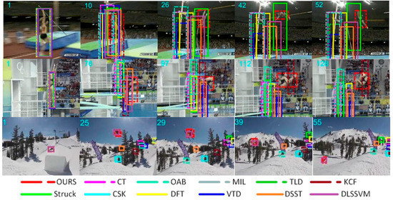 Figure 4 shows the tracking results with rotation. Jump, Diving, and Skiing are classic target rotation sequences, and were used as the test image sequences. In the Jump sequence, the target starts rotating from frame 10 and the algorithm proposed in this paper could solve the rotation problem better than other algorithms. In the Diving sequence, starting from frame 76, other algorithms began to lose the target, in addition to the proposed algorithm. In the Skiing sequence, our algorithm and the DLSSVM algorithm showed good performance and achieved a stable tracking target in fast rotation. In the entire process of tracking, the proposed algorithm could stably lock the target. In this scenario, the single frame image processing speed was better than 40 milliseconds.