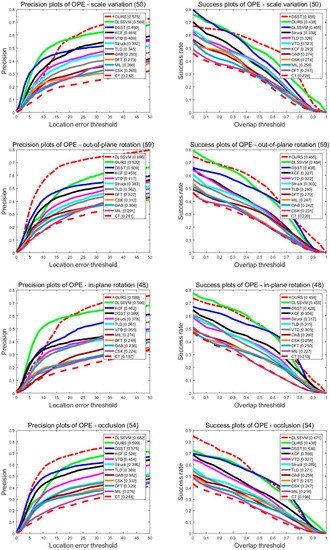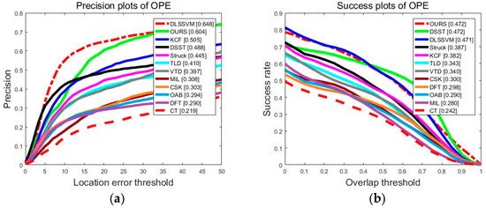 In this subsection, we evaluate the algorithm performance with one-pass evaluation (OPE), which is proposed in Reference [35]. We used two assessment criteria, including the success and precision plots. The precision plots are defined as the percentage of frames with the center position error less than the predefined threshold. The success plots represent the percentage of the frames in which the overlap rates of the tracking area and the boundary frame are larger than the threshold. For precision plots, the results at the error threshold of 20 were used for ranking. The area under the curve (AUC) of each success plot was used to rank the tracking algorithms.