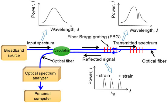 Figure 1 shows the working principle of a FBG sensor. When broadband light is injected into the optical fiber, a signal will be reflected with a wavelength centered around a specific wavelength. The reflected wavelength is related to the physical properties of the Bragg sensor and can be expressed as [23]: