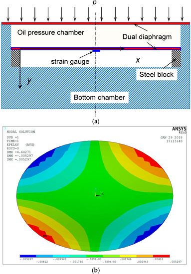 A finite element model (FEM) is established to analyze the stress and strain behavior of the proposed FPS by a commercial finite element software, ANSYS. The deflection of the diaphragm and cantilever beam under external pressure is analyzed with the FEM. The top cap of the FPS is simulated using a SHELL63 element. The cantilever beam is simulated using a beam element. The cantilever beam is 15 mm wide and 1 mm thick. Young’s modulus and Poisson’s ratio are 200 GPa and 0.3, respectively. The boundary conditions are indicated in Figure 5a. The outside of the diaphragm is fixed, and a stiff rod connects the diaphragm with the cantilever beam at the center of the model. The stiff rod transfers the deflection of the diaphragm membrane to the cantilever beam. An external pressure of 200 kPa is used to investigate the strain distribution on the diaphragm at different thicknesses. Figure 5b shows the results for axial strain on the diaphragm in the x-direction. As the strain is not uniformly distributed, directly measuring strain on the surface of the diaphragm would introduce errors. The unevenness of the strain distribution is clear from Figure 5c.