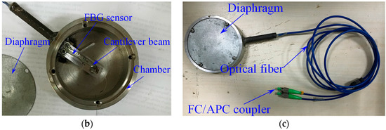 A further parametric study is carried out to examine the effects of Young’s modulus for the diaphragm, diaphragm thickness, and the dimensions of the cantilever beam. Figure 7 shows the results of sensitivity analysis for different Young’s modulus values and diaphragm thicknesses, and Figure 8 shows how the sensitivity of the FPS varies with the width and thickness of the cantilever beam, respectively. The results indicate that the sensitivity of the FPS decreases with the diaphragm’s thickness and Young’s modulus, but increases with the radius of the diaphragm. For the cantilever-type FPS, a smaller Young’s modulus also yields a finer sensitivity, and sensitivity decreases linearly with the width of the cantilever. However, the difference is not significant between bc values of 5 to 20 mm. The relationship between sensitivity and cantilever thickness is not monotonic: the function initially decreases to its minimum value, then rises gradually with an increase in Young’s modulus for the cantilever. For a Young’s modulus of 200 GPa, the minimum sensitivity lies between cantilever thicknesses of 1 mm to 2 mm. Combining the above design principles, as indicated in Figure 3, a prototype of the FPS is designed and fabricated in the laboratory. The diaphragm of the FPS is made of a stainless-steel shell with a thickness of 0.6 mm and a diameter of 90 mm. The cantilever beam is also made of stainless steel, and is 40 mm long, 15 mm wide, and 1 mm thick. The FPS has an overall diameter of 100 mm and a thickness of 30 mm. As the FBG sensors used in this study have a sensitivity of 1.0 με, the sensitivity of the FPS as calculated using Equation (10) is 0.105 kPa/με.