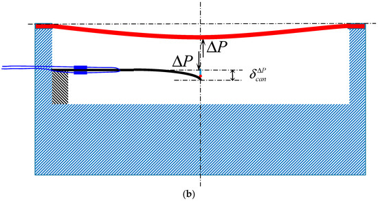 The working principle is shown in Figure 4. As indicated in Figure 4a,b, the deflection at the center of the diaphragm δdia can be divided into two parts: (a) deflection under a uniform pressure p applied on the surface of the diaphragm (Figure 4a and Equation (3a)); (b) deflection under an internal reaction force ∆P caused by the deformation of the cantilever beam (Figure 4b and Equation (3b)):