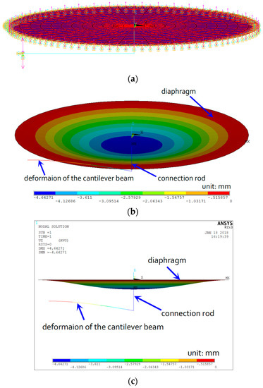 Simulation results of diaphragm and cantilever beam under external pressure of 200 kPa: (a) boundary conditions of the FEM model; (b) vertical deformation of the diaphragm; (c) vertical deformation of the diaphragm and the cantilever beam.