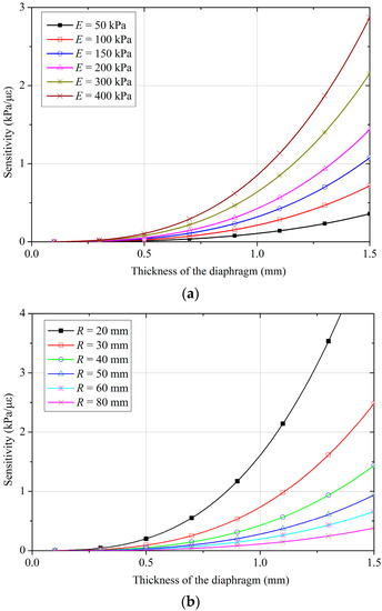 Sensitivity of the designed FPS with various thicknesses and (a) Young’s moduli, and (b) radii of the diaphragm.