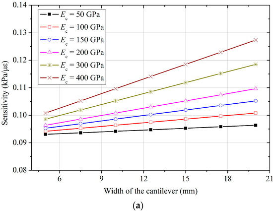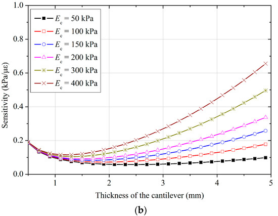 Sensitivity of the designed FPS with various Young’s modulus and (a) width, and (b) thickness of the cantilever.