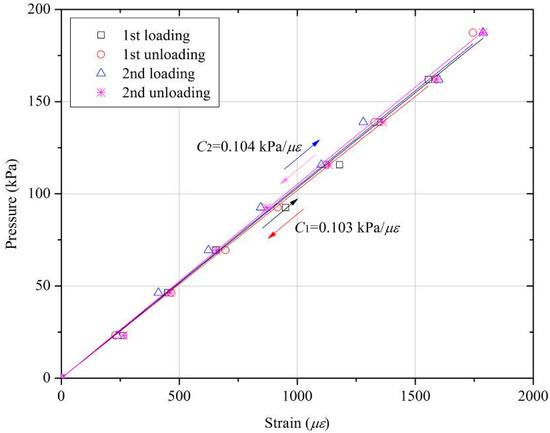 An experimental validation test is conducted in the laboratory. Before performing each calibration test, the connecting screw is carefully checked to ensure that it touches both the top cap and the cantilever without creating initial deformation. A step load with different counterweights is applied to the surface of the FPS, and an FBG sensor interrogator is used to record the measurements taken by the FBG sensors. At each external pressure, the shift wavelength of the FBG sensors is measured using the sm125 Optical Sensing Interrogator from Micron Optics. Thus, the bending strain εB of the cantilever beam can be calculated using Equations (2) and (9). Figure 9 shows the results for the applied pressure and bending strain calculated by the FBG sensors. Loading and unloading are repeated to confirm repeatability. The temperature effect is automatically eliminated using Equation (9).