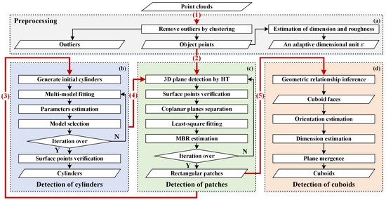 Procedure of the proposed spacecraft component detection scheme. The scheme consists of four modules: (a) preprocessing; (b) detection of cylinders; (c) detection of planar patches and (d) detection of cuboids. The scheme is implemented in the order from (1) to (5). Note that the flow lines starting with the borders of module blocks indicate that the remaining points are taken as input. HT, Hough transform; MBR, minimum bounding rectangles.