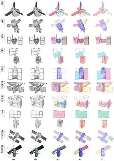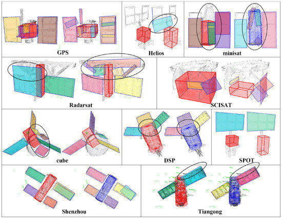 Figure 10 gives the comparison of the component detection results of [30] (the left ones) and our scheme (the right ones). Since this paper is a further improvement of [30], the approach in [30] is similar to that of this paper, except that: (a) the cylinder is detected with a novel axial-symmetry-based cylinder detection method lastly, rather than at beginning; (b) the MBR estimation approach is not improved; and (c) the patch mergence step is not introduced either. Through the comparison of Figure 10, we can see that: (a) the cylinders are more precisely detected due to utilization of more robust cylinder detection, for instance the cylinder main body of DSP; (b) contours of the detected patches are also better fitted due to improvement on MBR estimation, for instance the solar panels of GPS and Tiangong; and (c) the cuboids are better extracted due to the patches mergence steps, for instance the cuboid main body of Radarsat.