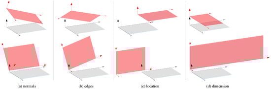 For criteria of both opposite and adjacent faces, Condition (i) constrains the orientation relations so that patch pairs with improper relative normal directions (Figure 3a) or edge directions (Figure 3b) can be filtered; while Condition (ii) constrains both the relative location and dimension so that patch pairs with a dramatic position deviation (Figure 3c) or unmatched dimensions (Figure 3d) can be filtered. It should be noted that the parallel and perpendicular relations are determined by a given maximal angle error in this paper.