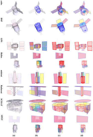 Most of these 3D data processing frameworks are interested in the modeling of city buildings and industrial installations, while little effort is made for other targets, such as spacecraft. As for the 3D data of spacecraft, feature points and local descriptors or global descriptors are often used for applications such as pose estimation and tracking, while further structure analysis is rarely involved, which is however crucial for future on-orbit operation and situational awareness, especially for non-cooperative space targets. Spacecraft mainly consist of solar panels, cuboid or cylinder modules; thus, they can also be regarded as a combination of geometric primitives like planes, cuboids or cylinders. Based on this simplification, a structural representation with higher level abstractions can be generated via the detection of such geometric primitives. Moreover, most of the 3D data processing approaches deal with laser scanning data, metric information and controllable quality, which are usually available; while this paper focuses on 3D data of spacecraft recovered by reconstruction, since it has more potential than laser scanning for the sake of hardware complexity, size and power requirement. Generally, such recovered data are often a scaled reconstruction rather than a metric one, and these data might also have different densities and noise levels due to variant texture quality. Therefore, special attention must be paid to scale variation, distribution variation and severe noise and outliers.