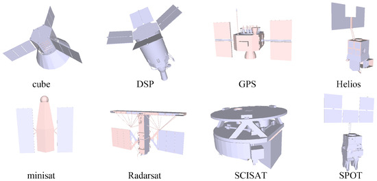 - Synthesized point clouds: The synthesized point clouds are generated by uniformly sampling the surfaces of 8 spacecraft computer-aided design (CAD) models in the BUAA space object image dataset (BUAA-SID) [4]. Origin CAD mesh models of the 8 spacecraft are shown in Figure 5. To test our scheme and evaluate its robustness, synthesized data with different point distribution densities, position noise and direction noise are generated. To add position noise, a deviation of along a random direction is added to every point. n is a standard Gaussian noise, and is a distance deviation coefficient, which takes , or ( is the dimension length described in Section 2.1). To add direction noise, a rotation of a random direction with angle is applied to the normal of every point. is a direction deviation coefficient, which takes , or . We use {01U, 02U, 04U} and {05D, 10D, 15D} to denote different levels of position and direction noise, respectively.
