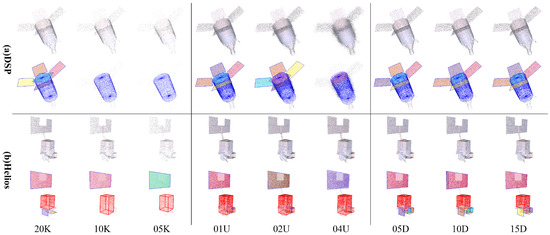Results of robustness analysis with a single factor. The first grid row is the detection results of spacecraft (a) DSP, and the second grid row is the results of (b) Helios. From left to right, the grid columns are point clouds with different sample numbers (**K_00U_00D), different distance noises (50K_**U_00D) and different direction noises (50K_00U_**D). The top row in each grid displays the origin input point clouds, and the bottom row displays the final results. The cylinders are rendered in blue; patches are rendered in different colors; and cuboids are rendered as red boxes.