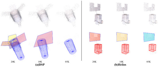 Results of robustness analysis with integrated factors. The left grid column is the detection results of spacecraft (a) DSP, and the right grid column is the results of (b) Helios. The top row in each grid displays the origin input point clouds, and the bottom row displays the final results. From left to right in each grid are point clouds with different sample numbers (**K_04U_15D). The cylinders are rendered in blue; cuboids are rendered as red boxes; and patches are rendered in different colors.