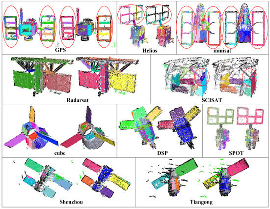 Figure 9 shows the plane detection results of [25] and our scheme on the reconstructed point cloud data. In [25], the 3D points are stored as an octree, and planes are detected by RANSAC. Note that [25] focuses only on the detection of planes; outliers are not specially concerned, and no further bounded patch model is generated either. As shown in Figure 9, the result points of [25] (the left ones) are rendered with different colors according to their verification results. For convenient comparison with [25], results of our scheme just after the patch detection step are also given in Figure 9 (the right ones), which are rendered with the same pattern as the results of [25]. We can see that the noise of these point cloud data causes many undesired planes in the results of [25], such as the solar panel areas of spacecraft GPS, Helios and minisat. Moreover, the division nature of octree in [25] could also lead to additional planes; for example, the blue plane of metric SCISAT as emphasized in Figure 9; while the planes generated by our scheme are more compact and clean. The reason mainly lies in the employment of adaptive dimensional unit , which makes our scheme robust to both scale variation and noise.
