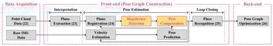 At this point, the degeneracy can be induced if less than three independent plane-pairs are used. As these degeneracies provide clear evidence in the second moment matrix, the degeneracy detection algorithm (in Section 2.1, our first contribution) can analyze the matrix and pinpoint the degeneracy direction. Then, the pose compensation algorithm (in Section 2.2, our second contribution) can compensate for the degeneracy by projecting it to that of the IMU. Remaining procedures are conventional loop detection and back-end optimization adopted from methods in [,], respectively.
