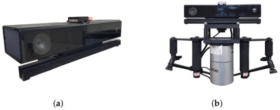 For performance validation, SLAM experiments were conducted with two different sensor systems as shown in Figure 4. One (Figure 4a) is a low-cost sensor system with a Kinect v2 and cheap IMU (CH-UM7: ±4° for dynamic pitch/roll accuracy, ±8° for dynamic yaw accuracy). The other (Figure 4b) is a high-cost sensor system [] with Velodyne LiDAR (HDL-32E) and MicroStrain IMU (3DM-GX3-45: ±2° for dynamic pitch/roll/yaw accuracy). The purpose of the high-cost system is to extract the ground truth.